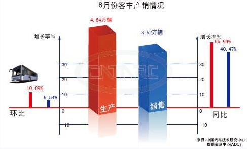 中國汽車技術(shù)研究中心提供數(shù)據(jù)顯示,6月份客車產(chǎn)銷量分別為4.64 萬輛和3.52萬輛,環(huán)比分別增長10.09% 和5.54%,同比分別增長56.99%和40.47%。
