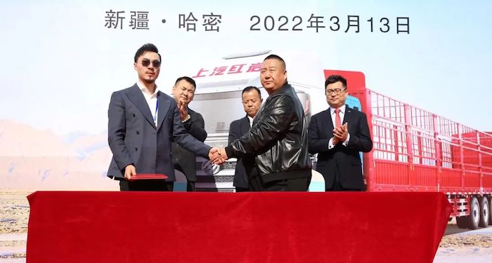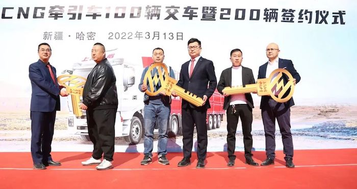 2022年3月13日,上汽紅巖新疆版CNG牽引車100輛交付暨200輛簽約儀式在新疆哈密隆重舉行。這是上汽紅巖全新產(chǎn)品——搭載了上汽動(dòng)力12ET發(fā)動(dòng)機(jī)的紅巖杰獅C6 PLUS CNG牽引車首次交付。