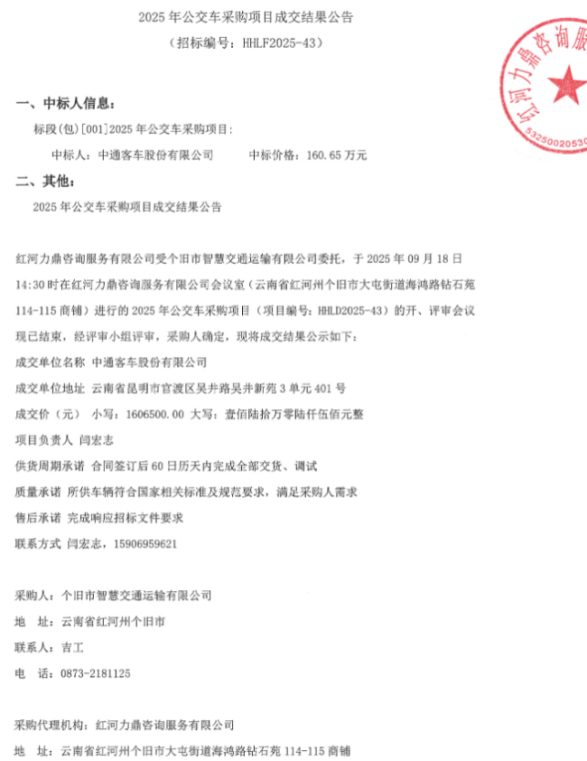 9月19日,云南這一地2025年公交車采購項目成交結(jié)果公告發(fā)布。中標(biāo)人為中通客車股份有限公司,中標(biāo)價格為160.65萬元。
