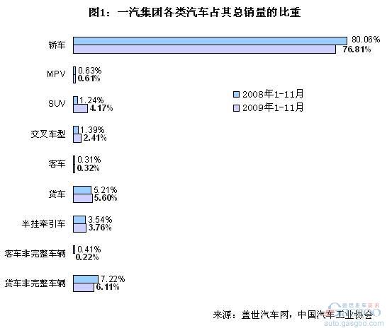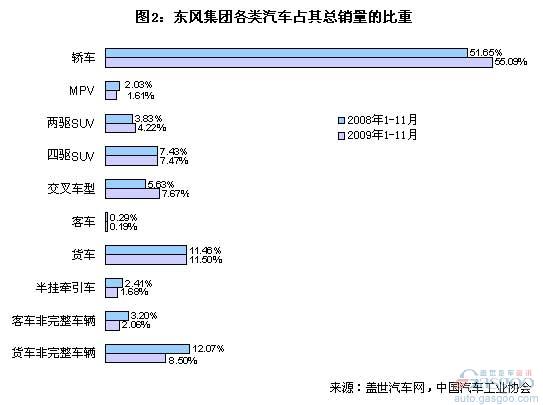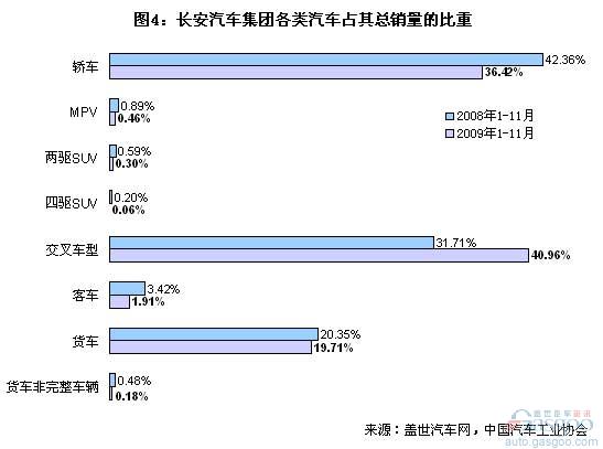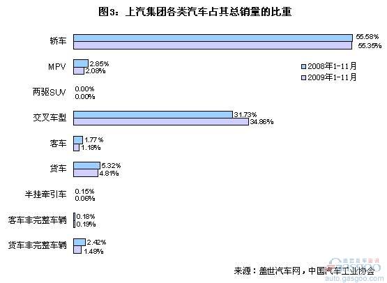 2009年1-11月中國的商用車銷量增長率為23.80%。同期,上汽集團的商用車業(yè)務比重在四大集團里依然是最低的,2009年1-11月其商用車業(yè)務比重比2008年1-11月又有所下降。具體卡客車等銷售情況見下表: