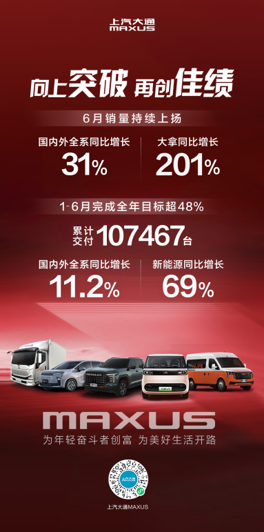 0在市場(chǎng)規(guī)模微增、新能源替代加速、消費(fèi)需求升級(jí)及國(guó)際競(jìng)爭(zhēng)加劇的行業(yè)背景下,中國(guó)商用車(chē)市場(chǎng)正加速洗牌。2025年上半年,上汽大通MAXUS以“爆品驅(qū)動(dòng)銷(xiāo)量”,6月熱銷(xiāo)19,954輛、同比激增31%。半年累計(jì)銷(xiāo)量達(dá)107,467輛、同比增長(zhǎng)11.2%,新能源車(chē)型同比增長(zhǎng)69%。躍進(jìn)輕卡系列6月銷(xiāo)量同比大增132.9%,上半年同比增長(zhǎng)89.1%,以強(qiáng)勁增速領(lǐng)跑城配物流市場(chǎng);“創(chuàng)富神車(chē)”大拿成為商用車(chē)新能源轉(zhuǎn)型的標(biāo)桿爆品,進(jìn)一步夯實(shí)上汽大通“中國(guó)輕客第一品牌”的市場(chǎng)地位。