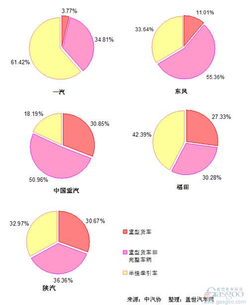 陜汽和福田的這三類車的效率比重相對比較均衡,尤其是陜汽的分布近乎各占三分之一,而福田的半掛牽引車比重稍高(為42.39%)。
