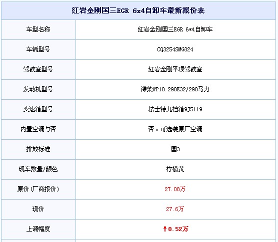 紅巖自卸一直深受用戶們的追捧,現(xiàn)由于鋼材漲價(jià),濰柴發(fā)動(dòng)機(jī)供不應(yīng)求,導(dǎo)致濰柴發(fā)動(dòng)機(jī)的漲價(jià),所以紅巖車型的價(jià)格也有所提高。小編最近就獲得了一款紅巖金剛的價(jià)格行情,大家一起來看看吧。